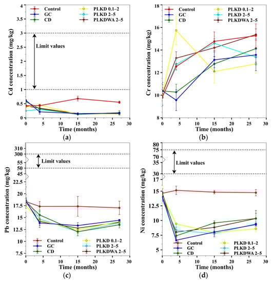 Changes in heavy metal (Cd, Cr, Ni, and Pb) concentrations in the soil during the liming period are shown in Figure 8. The total Cd content in the soil before liming was 1.95 ± 0.140 mg/kg (Figure 8a). According to The EU Commission Council Directive 86/278/EEC [], the Cd content in the soil before liming does not reach the maximum allowable limit. After 15 months of application of liming materials, the total Cd content in soil was reduced 3 times from 0.45 ± 0.140 mg/kg to 0.14 ± 0.013 mg/kg. Cd concentration in the control treatment (unlimed) increased 1.3 times in 27 months, from 0.43 ± 0.035 mg/kg to 0.55 ± 0.040 mg/kg. Cd content after liming decreased because liming neutralized H+ ions and reduced Cd bioavailability. Additionally, pH change can increase negative surface charge, which in turn could result in Cd adsorption and precipitation as Cd carbonates, reactions to Cd(OH)2, and the reduction of Cd2+ to Cd0. Cd content in unlimed soil–control increased due to the pH decrease, which may increase the enhanced solubility and mobility of cadmium in soil. Ramtahal et al. field and laboratory studies showed that liming reduced bioavailable Cd in soil and Cacoa beans []. Shaheen and Rinklebe used different low-cost alternative amendments to show that the application of cement kiln dust decreased soluble and exchangeable Cd content in the soil []. Total Cr content before the application of liming materials ranged from 9.77 mg/kg to 10.4 mg/kg and averaged at 10.1 ± 0.26 mg/kg (Figure 8b). The application of natural liming materials (GC and CD) slightly reduced Cr amounts in the soil while PLKD 0.1–2, PLKD 2–5, and PLKDWA 2–5 increased Cr content. In general, the amount of Cr in the soil can vary depending on the heterogeneity of soil and fertilization, and mineral fertilizers (especially phosphorus) can increase it. After 27 months of liming, the amount of Cr in soil increased 55% in the control treatment and 52% in the limed treatment with PLKDWA 2–5, while the smallest increase was obtained when limed with PLKD 0.1–2. This is due to H+ competition for binding sites enhancing metal release from the soil matrix.