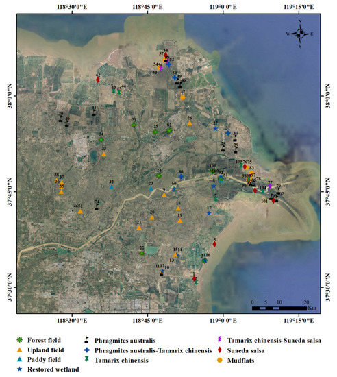 According to the survey results of vegetation in the Yellow River Delta, ten types of vegetation types, forest field (Robinia pseudoacacia, n = 9), upland field (corn, cotton, n = 16), paddy field (n = 3), restored wetland (weed, n = 9), Phragmites australis (n = 16), Phragmites australis-Tamarix chinensis (n = 6), Tamarix chinensis (n = 12), Tamarix chinensis-Suaeda salsa (n = 8), Suaeda salsa (n = 9), and mudflat (n = 18) were chosen (Figure 1). In June and July 2018, totally 106 surface soil samples were collected at a depth of 0–10 cm in the selected sites. Then, the samples were sealed in clean polyethylene plastic bags and transported to the laboratory. All soil samples were air-dried for at least 3 weeks, and extraneous matter, such as leaves and large stones, was removed. Then, the soil samples were ground into particles with diameters of less than 200 μm and stored at 4 °C before analysis.