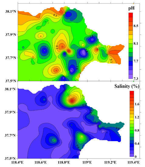 To analyse the spatial distribution of pH and salinity in the Yellow River delta, interpolated figures were graphed based on the Kriging method. As shown in Figure 2, the pH was higher in the northwest and south coastal areas, which were mainly mariculture areas. In addition, the soil in the Yellow River delta had a higher pH, which indicated that seawater intrusion might occur in this area. The salinity in the northeastern area was higher than that in the southern area, which was caused by the different levels of seawater intrusion. The depth of seawater in the northeastern area (Bohai Bay) was deeper than that in the southern area (Laizhou Bay). This phenomenon indicated that the northeastern area experienced more erosion from seawater, which affected the soil salinity in the coastal area.