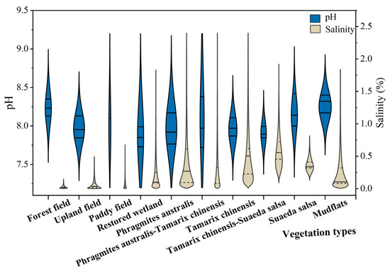 The lognormal distributions of pH and salinity in the study area are shown in Figure 3. The pH values in forest fields and Suaeda salsa were higher than those of other vegetation types. The pH value fluctuated sharply in areas frequently influenced by water, such as the paddy field, restored wetland, Phragmites australis, and Phragmites australis-Tamarix chinensis vegetation types.