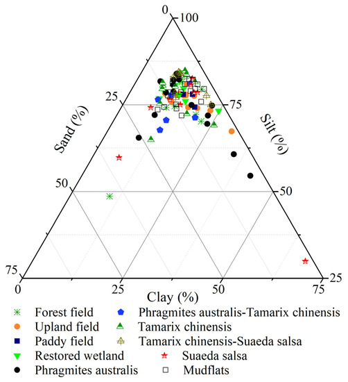 There were many factors that affected the particle size in the study area. In our study, the mean proportions of clay were over 16% in the upland field, paddy field, Phragmites australis, and Suaeda salsa, which were totally higher than those in other vegetation types. This confirmed that factors such as agricultural activity, the presence of plant roots, and seawater erosion could make the particle size of soil finer, which would then affect the metal concentrations [53,54].