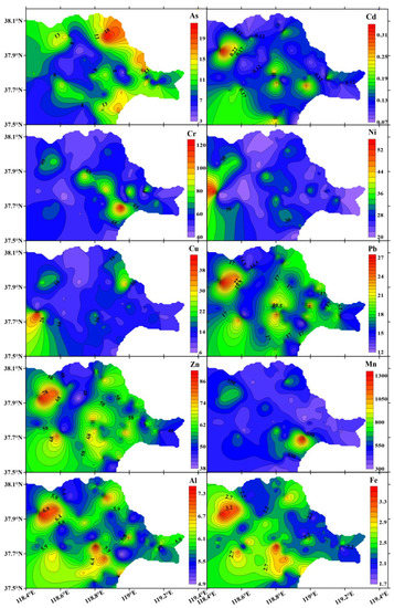 The coefficient of variability (CV) was used to analyse the dispersion degree of the data, which could display the differences in the spatial distribution of metals. Normally, if the CV is higher than 0.3, then the spatial distribution of metals is very different. In this study, the CV of As, Cd, and Cu showed that there were large differences at the different sites for these metals. The CV of Al was 0.10, which showed that the spatial difference of Al was not as obvious. Considering that the mean concentration of Al was lower in BD and BY, the parent material was regarded as the main source for Al. The skewness of all the metals was over zero, which means that the metal concentration was similar to a skewed normal distribution. This phenomenon indicated that there were some samples with higher metal concentrations.