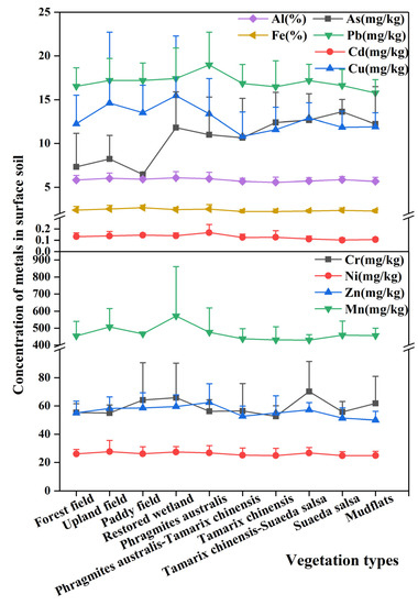 The mean concentrations of Pb and Zn in Phragmites australis were 18.98 mg/kg and 62.46 mg/kg, respectively, which were higher than those of other vegetation types. There was little difference between different vegetation types in the concentration of Al. A higher concentration of Fe occurred in Phragmites australis (mean concentration 2.50%) and paddy field (mean concentration 2.67%), whose roots could promote Fe adsorption in the soil [34,35]. The highest concentration of Cr occurred in Tamarix chinensis-Suaeda salsa, with a mean value of 70.19 mg/kg. The standard deviation in the restored wetland was high for most metals, and the main reason for this was the different times of restoration and the different situations before restoration.