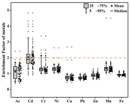 where Cx represents the concentration of the metal x and Cref is the concentration of the reference metal. The reference metal usually exhibits weak geochemical activities and is less affected by human activities, such as Al, Fe, and Mn [28,29]. In this study, Al was selected as the reference metal because the Al concentrations in the soil samples were all close to the background value of Shandong Province [27]. Generally, five contamination categories were recognized on the basis of the enrichment factors: deficient to minimal enrichment (<2), moderate enrichment (2–5), substantial enrichment (5–20), very high enrichment (20–40), and extremely high enrichment (>40) [30].
