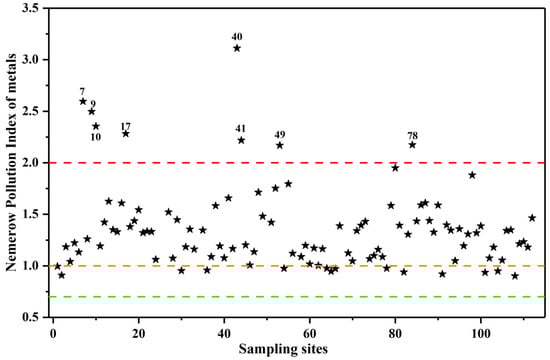 where Px is the single pollution index of metal x; Cx represents the concentration of metal x; Sx represents the background values of the study area, which refer to the metal background values of Shandong Province [27]; Px,max is the maximum value of the single pollution index of metal x; and Px,mean represents the average value of the single pollution index of metal x. According to the value of the NPI, five contamination categories were recognized: non-pollution (NIPI ≤ 0.7), warning line of pollution (0.7 < NIPI ≤ 1), low-level pollution (1 < NIPI ≤ 2), moderate-level pollution (2 < NIPI ≤ 3) and high-level pollution (NIPI > 3) [33].