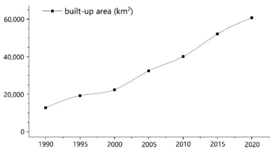 Urban expansion has played a crucial role in China’s economic development in the past 30 years. In China, the urban land is monopolized by the government, and urban expansion relies on land supply of the government [30]. Through land supplying, on the one hand, the local governments could generate an amount of financial revenue, which supports the local economic development [35,36]. On the other hand, compared with the inner-city land, the low-cost expropriated land is conducive to the investment growth and the industrial development, which provides many development opportunities for the city [34,37]. Therefore, under the GDP-oriented performance achievement assessment, the local governments always tend to supply more land for urban expansion to stimulate local economic growth and achieve political promotion [38]. According to the statistical yearbooks, the urban built-up area in mainland China has increased to 60,721.32 km2 in 2020 (Figure 1). This is 2.7 times that of in 2000 (21,379.56 km2) and 4.7 times that of in 1990 (12,856 km2) [39]. Meanwhile, China’s urbanization rate is predicted to continue to grow at a speed of approximately 1% per year and reach 70% by 2030. By then, approximately 1 billion people will be living in cities [40], and a massive demand for urban land will be generated in the future.