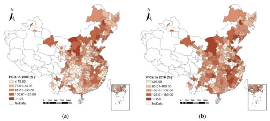 PCI values of 280 prefecture-level cities in China in 2009 (a) and 2016 (b).