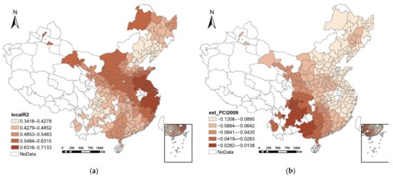 Spatial patterns of local R2 and coefficients for PCI in the GWR model. (a) Local R2, (b) local coefficients of PCI.