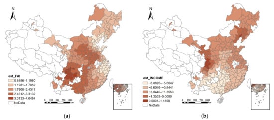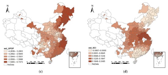 The spatial distribution of local regression coefficients of the four control variables is shown in Figure 7. In terms of the investment factor, FAI has a significant positive impact on ULES, and the impact of FAI on ULES is relatively greater in underdeveloped areas such as southwest and central China (Figure 7a). With regard to income (Figure 7b), it has an overall negative impact on ULES except for several exceptions (the major disaster-stricken areas due to Sichuan M_S 8.0 Earthquake in 2008) in Sichuan and Gansu. This finding suggests that the growth rate of urban land will slow down under the condition of increased income level. Urban population has a sustained negative effect on ULES (Figure 7c). The spatial distribution of regression coefficients shows that the central and southwestern regions of China are more sensitive to the change in urban population. The growth of the secondary industry is considered one of the main reasons for the growth of urban land [28,50], and this study finds a similar result. The impact of secondary industry changes on ULES is positive on the whole, especially in the Middle Yangtze Region and the Middle Huanghe Region (Figure 7d).