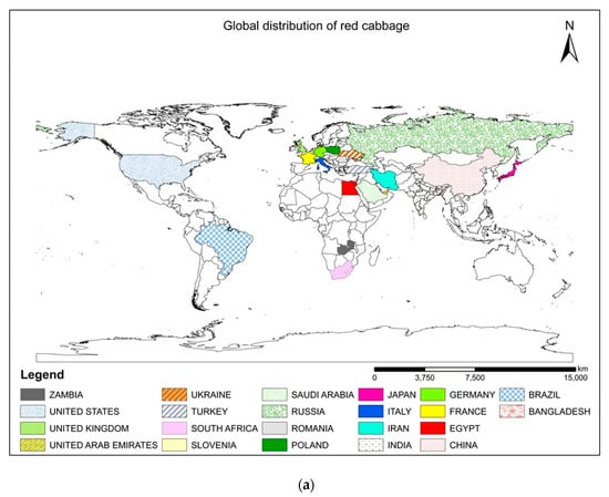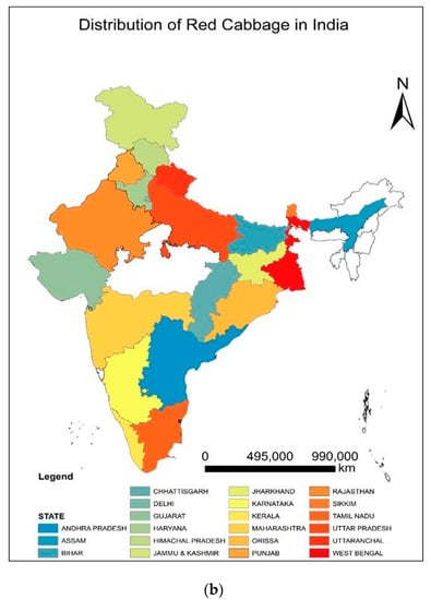 Red cabbage [Brassica oleracea L. var. capitata L. f. rubra (L.) Thell], commonly known as the modern multitasker’s dream food, has recently gained increased attention around the world. This remarkable nutritious vegetable is an excellent source of health-promoting ingredients that can boost our immune system []. The choice of crops is also an important armament in our arsenal against degenerative diseases that have devastated human livelihoods and crippled the global economy. The abundance of anthocyanins, carotenoids, glucosinolates, antioxidants, vitamins (C, E, A, and K), minerals (K, Ca, Mg, Fe, and Mn), and phenols in red cabbage make it a suitable supplement for preventions against oxidative stress, cardiovascular disease, cancer, obesity, and diabetes [,]. Therefore, it is directly consumed as microgreens (Figure 1) and salads and also cooked as a vegetable. The microgreens of this plant contain higher β-carotene (~260-fold), vitamin C (2.4−6-fold), and vitamin E (>40 times) than the matured ones []. Natural dyes are extracted from red cabbage due to the presence of high levels of anthocyanins (40–188 mg Cy 3-glcE 100 g−1 FW), which are suitable for coloring food products []. The nutritional value of red cabbage is greater than white cabbage in terms of antioxidants [], vitamins, and minerals []. This will fetch farmers higher market prices and sell their products in supermarkets []. Although cole crops are native to the Mediterranean region, currently, red cabbage is cultivated globally [,] (Figure 2a). The geographical distribution maps can highlight the crop’s popularity and direct the need for suitable production strategies to maintain sustainable agriculture. Red cabbage is grown in all of Europe [], North America, Asia, China [], Brazil [], South Africa [], Japan, and many other countries of Asia and Africa [,,]. Growing belts of this cruciferous leafy vegetable can be found in almost all states of India [,] (Figure 2b).