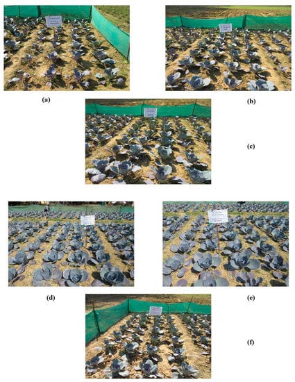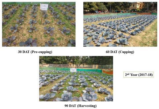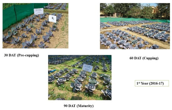 All data related to the growth response of cabbage were collected at different stages (Figure 3) of crop growth, viz., 30 (pre-cupping), 60 (early head formation), and 90–110 (maturity or harvesting) days after transplanting (DAT), except root length and earliness.