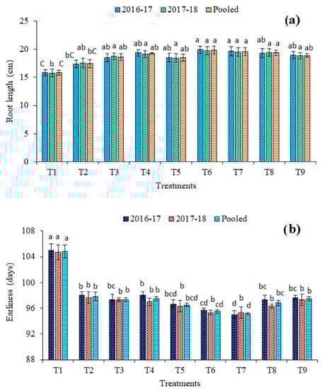 The experimental setup consists of nine treatments and three replications. Data presented as mean were analyzed through Statistical Package for Social Science (SPSS, version 20) software. Data were subjected to analysis of variance (ANOVA) F test with the total degrees of freedom being 26. The significance of the difference between treatment means was analyzed using Duncan’s multiple range test (DMRT) at p ≤ 0.05 significance level. Pooled data represented the average value of two years. Regression analysis was executed to find out the relationship between the chlorophyll, root length, earliness, and micronutrient uptake (Fe, Mn, Zn, and Cu).