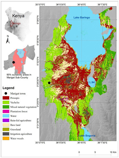 The study was conducted in Marigat Sub-County (Figure 1), in the eastern lowlands of Baringo County, Kenya (11,075 km2). Marigat was selected because it is representative of a densely invaded agro-pastoral area that has experienced a substantial impact on local rural livelihoods. Since the 1980s, the native vegetation—trees such as Vachellia tortillis, Boscia spp。, and Balanites aegyptiae as well as native grass species and shrubs such as Salvadora spp.—has been severely invaded and displaced by Prosopis [9,18]. Prosopis stands in Baringo County are mainly confined to Marigat sub-county [19].