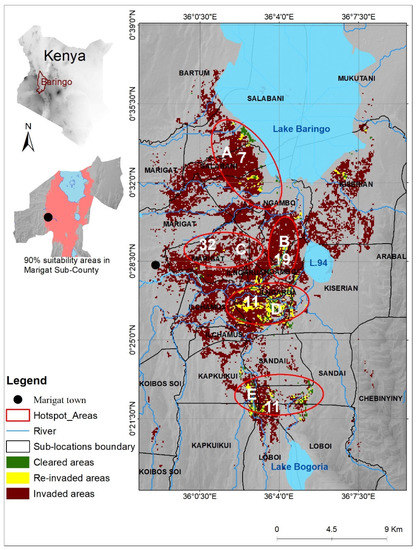 - Mbaabu, P.R.; Ng, W.T.; Schaffner, U.; Gichaba, M.; Olago, D.; Choge, S.; Oriaso, S.; Eckert, S. Spatial Evolution of Prosopis Invasion and Its Effects on LULC and Livelihoods in Baringo, Kenya. Remote Sens. 2019, 11, 1217. [Google Scholar] [CrossRef]