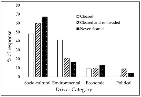 The need to understand drivers that influence land users’ management decisions and their mutual linkages is widely acknowledged as vital for informing sustainable invasion management strategies. Thus, previous studies [14,16,17] have identified governance decisions, environmental conditions, and social and economic dynamics as the key drivers of invasion management. These drivers are multi-dimensional and have complex systemic interactions, making it necessary to adopt a holistic approach to addressing them [11,16]. However, to inform spatially explicit management approaches at a landscape level, there is a need to contextualize these drivers based on their spatiotemporal extent.