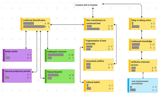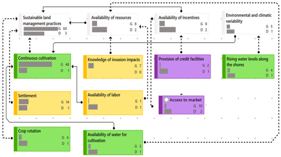 Drivers of continuous clearance (yellow = socio-cultural; green = environmental; purple = economic). Arrows indicate the nature and direction of relations (dotted = “indicates”; solid = “promotes”). G is the groundedness, referring to the number of linked quotations. D is the density, referring to the number of linked codes. The length of bars within each box indicates the frequency of G and D. The significance of a code is determined by its groundedness (G): The G-value increases with an increasing number of respondents who mentioned it.