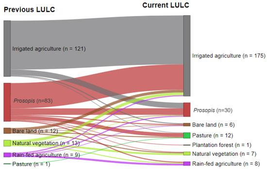 Respondents reported that incentives are significant in enabling the sustainable management of IAS. Land users are unlikely to invest in SLM practices on parcels for which management is not incentivized or where benefits are not guaranteed. Credit facilities, access to market, and better pricing of farm produce (Figure 3) help farmers in availing the means needed for the implementation of practices on cropland. For example, the National Irrigation Board (NIB) engages community members through the contractual farming of maize seeds (personal interviews with area chiefs). This arrangement helps land users to access a ready market for their produce. The NIB also extends credit facilities and extension services to farmers through irrigation schemes—factors that promote the clearance of land for cultivation purposes. This is perceived to be the reason why land users consistently clear land within established croplands, especially along the shorelines of lakes and rivers, where constant water supply sustains year-round irrigation. This finding is supported by the fact that 51.5 hectares (62%) of parcels that were cleared of Prosopis were converted into irrigated farms, while 106 ha (88%) of irrigated farms have never been converted to other uses (Figure 5).