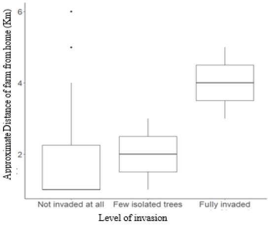 Relationship between the level of Prosopis invasion and the distance of farms from the homesteads. The boxes indicate the median (the thick line separating the box into two) and the lower and upper quartiles (lower and upper border of the boxes); the whiskers extending from the lower and upper quartile marks indicate the scores falling outside 50% of the total scores, while the dots represent outliers.
