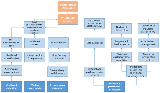Unlike the positive drivers, the negative drivers are numerous, diverse, and limit the performance of the positive drivers. Addressing the negative drivers should therefore be prioritized to achieve sustainability in the management of invasive species. Hence, we will first discuss the causal linkages among negative drivers and their association with critical socio-ecological factors that limit SLM adoption and continued implementation (Figure 8). The study applied the local actors’ model as an explanatory framework for relating how linkages among different drivers provide a rationale for land users’ management decisions.
