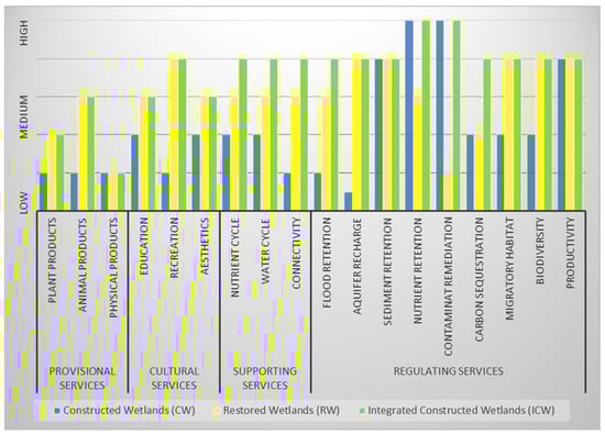 Figure 1. Idealized Ecosystem Services of Ecosystem Services provided by constructed wetlands (CW) for wastewater treatment, restored wetlands (RW), and integrated constructed wetlands (ICW). Based on Ecosystem Services categories of the Millennium Ecosystem Assessment as applied to wetlands [4,66,67].