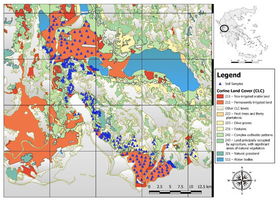 The data collection took place in the winter of the years 2019–2020. The selected fields (364) are located mainly in the area of the municipalities of Messolonghi and Agrinio in Western Greece (Figure 1). Samples were clustered based on both land use/cover and national soil maps (ESDAC) in the study area. From the total 364 samples, about 30% of the composite soil samples were collected from annual and pasture or abandoned land, while 40% were from permanent crops, in order to have a representative presence of each type of land use (LU) with the approximately same slope gradient (0–2%) and climatic conditions. Each field covered an area of approximately 0.5–3 ha. Fields of permanent crops included approximately 200 olive trees, 330 citrus trees, 450 kiwi fruits, 80–88 thousand plants of maize, 90–100 thousand plants of cotton, etc.
