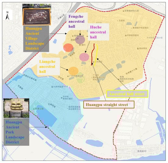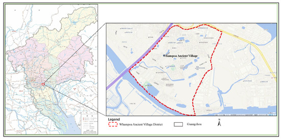 Huangpu Ancient Village is located in the east of Pazhou Island, Guangzhou. It is close to Huangpu Ancient Port and approximately 3.5 km away from Pazhou International Exhibition Center, China Import Commodities Fair (Canton Fair) (Figure 1). As this ancient village was once one of the starting points for China to link the global Maritime Silk Road, its history was created by international trade and a complicated clan and overseas Chinese network. After the Qing Dynasty, water around Huangpu Ancient Village Port Pier replaced the increasingly congested Fuxu Port, becoming the anchorage of foreign commercial ships in Guangzhou [22]. The total foreign trade volume of this ancient port in 1817 was CNY 19.71 million [23]. Due to the development of foreign port trade, Huangpu’s historical village gradually became an important hub of transnational maritime trade and cultural exchanges. The village layout was also influenced by the international marine trade, which includes the ancestral hall, former port, and the rear village of the ancient town village of the Silk Road port.