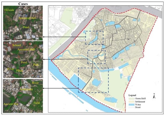 Huangpu Village’s land types reflect its rich history. Although it no longer serves as a foreign trade port, the village has formed a space prototype of representative port villages and towns in Guangzhou’s Millennium foreign trade history development, representing the history of Guangzhou Maritime Silk Road and Lingnan characteristic buildings. The village’s land-use status includes green space, residential area, water area, and roads. There are three types of land use. The first type is ancestral halls distributed around wind ponds, and some ancestral halls have been built against hillside green spaces. The second type is the square, park, wind pond, and ancestral hall along the Hucun River, with schools next to the ancestral hall. The third type is the mixture of historical docks, rivers, residential areas, and farmland (Figure 2).