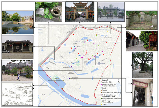 Distribution map and typical landscape of material cultural resources in Huangpu Historical Village (photo collected by author).