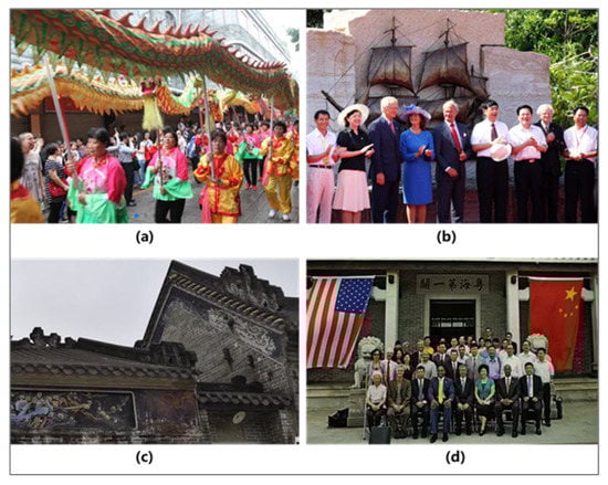 The intangible cultural resources of Huangpu Ancient Village: (a) dragon dance celebrating the honoring of the birth of Emperor Zhenwu; (b) group photo of the leaders of China and Switzerland in front of the sculpture to welcome the return of the Gothenburg; (c) the limestone-sculptured decoration on the ancient residence in the village; (d) group photo of Chinese and foreign guests at the 230th anniversary of the Queen’s maiden voyage to China (photo collected by author).