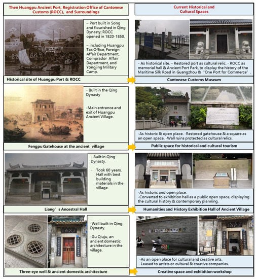 As a traditional village prospered by Hong Kong in the Ming and Qing Dynasties, Huangpu Ancient Village has now been transformed into a modern historical city village symbolizing Guangzhou’s foreign trade window city. These cultural heritage resources can construct historical identity and enhance social cohesion. Due to the entry of cultural and creative artists and tourists, the streets centered in the ancient village landscape have now become lively. The historical village’s environment has been improved through two phases of upgrading and renovation. The number of tourist reception facilities on both sides of the original street has increased, which has brought certain income and employment opportunities to residents. Meanwhile, the Huangpu Village government has repaired the decaying buildings to attract foreign tourists to improve the competitiveness of urban historical villages. The reliance on the government and commodification of historical buildings for heritage tourism has limited the revival to commercial spaces. As a result, the scenic areas have not yet been included in the tourism development.