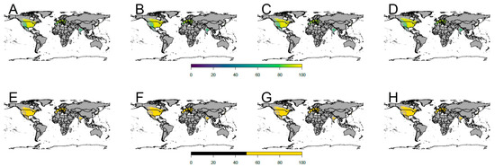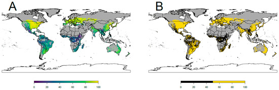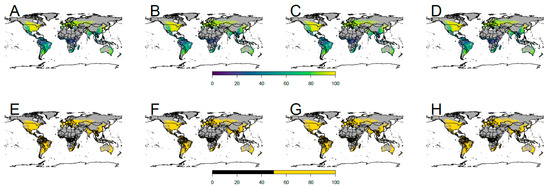 Conversely, increasingly hot and dry future conditions reduce the previously suitable range of areas (Petty et al., 2015 [17,90]. However, in contrast to previous studies [17], the narrowing of the suitable range for Pj does not involve all continents in the Southern Hemisphere, but only Central and South America experience a decrease of about 10% of their current suitable territories. In the rest of the Southern Hemisphere, suitable areas increase but only slightly in Australia.