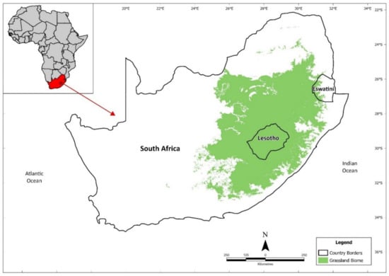 Extent of the Grassland Biome in South Africa, Lesotho and Eswatini. Grassland coverage is derived from the National Vegetation Map, South African National Biodiversity Institute (2006–2018), The Vegetation Map of South Africa, Lesotho and Eswatini; Mucina, L., Rutherford, M.C., Powrie, L.W., Eds.; online: http://bgis.sanbi.org/SpatialDataset/Detail/18; version 2018 (accessed on 22 February 2022).