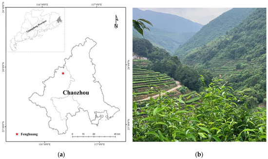 (a) Map of the research area in Guangdong, China. (b) Tea plantation in Fenghuang. Source: photograph by the first author.