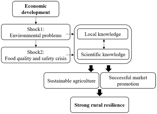 Currently, due to increasing modernization and industrialization, several social, economic, and environmental problems have emerged globally [1]. These changes are experienced differently at various spatial scales and obviously affect rural areas [2]. Continuous productivist dominance leads to several social and ecological issues, such as crop degeneration, biodiversity reduction, and environmental deterioration [3,4]. These are manufactured risks derived from dramatic technical changes [2] that decrease farmers’ ability to withstand disasters [5] and imply that we need to enhance rural resilience to the unpredictable, dynamic, and “slow burn” disturbances of the present [6].