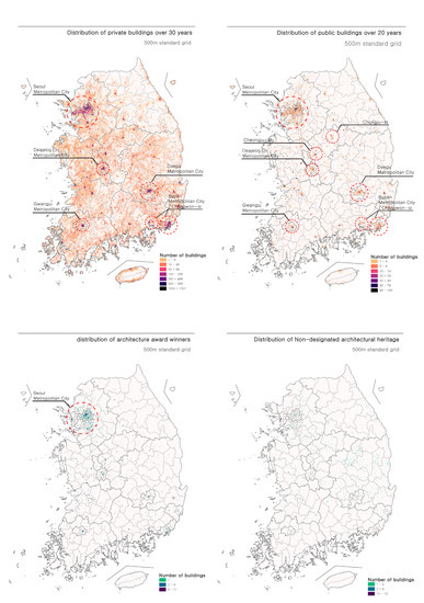 Private buildings over 30 years old were concentrated in major metropolitan cities, including Seoul. Although the number of public buildings over 20 years old was smaller than that of private buildings, they showed a similar trend. This is because there were many buildings in areas with large populations, such as metropolitan cities, with the density being high in the old downtown areas. Similarly, architectural award-winning buildings were concentrated in metropolitan areas, such as Seoul and Gyeonggi-do. It could be inferred that the tendency of buildings that could be recognized for their architectural workmanship was concentrated in the metropolitan areas, proportionate to the size of the population and the economy. Consequently, the distribution of most of the architectural award-winning works targeting new buildings were somewhat different from the distribution of private and public buildings located in the old city center.