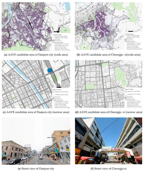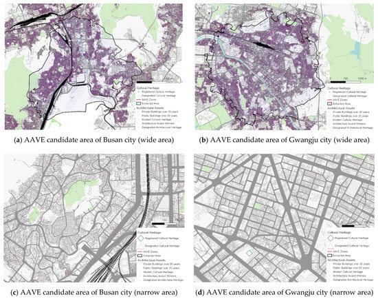First, in Busan Metropolitan City, architectural asset candidates were concentrated in Dong-gu and Busanjin-gu. The derived area was approximately 13 km2 and was triangular in shape, owing to the geographical characteristics of the mountains and sea (Figure 8a). The Sujeong-dong area was located on a sloping topography at the foot of the Gubongsan Mountain on the west side of Busan Station (Figure 8c). Busan has a long history as a port city, so the historical scope of buildings is diverse. Dong-gu is an open port, with modern cultural heritage sites, such as Japanese-style buildings and warehouses. Although old private buildings are distributed at a high density, there are many buildings with historical characteristics in Busan (Figure 8e). Thus, it was judged as an area with a high possibility of being designated and managed as an AAVE zone (Figure 8).