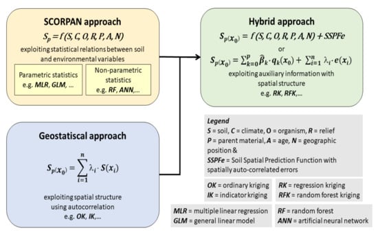 Integration of the SCORPAN model with geostatistical approaches for digital soil mapping (adapted from: [13]).