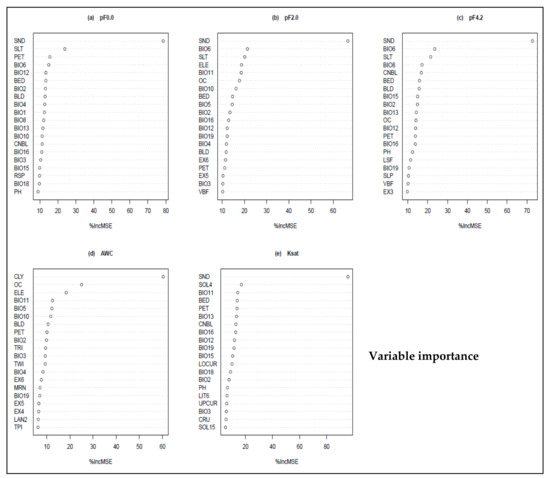 Sand, silt, clay content, and soil organic carbon content as soil environmental covariates, climate variables such as the average annual rainfall, the average annual reference evapotranspiration (ETo), and the mean temperature of the coldest quarter, as well as topographic elevation, are all strong predictors of water content at pF0.0, pF2.0, pF4.2, the AWC, and Ksat. Moreover, the sand, silt, clay content, and soil organic carbon content layers are obtained from the SoilGrids databases, hence are themselves the result of machine learning based DSM. Inevitably, they contribute to error propagations to our estimated soil hydraulic properties.
