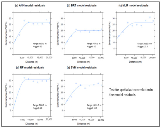 Spatial autocorrelation of the model residuals was only observed in the random forest model for the water content at pF0.0, pF2.0, pF4.2, and the available water capacity. There was no spatial autocorrelation of the model residuals for any of the five models for the saturated hydraulic conductivity. Once spatial autocorrelation in the model residuals was confirmed for the random forest model, the kriged model residuals were added to the model estimations, and this addition resulted into a better performance of the deterministic models, whereby the R2 was observed to improve substantially.