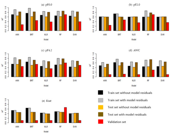 Coefficients of determination (R2) for the five DSM models applied to the training sets without residuals (black), training sets with residuals (grey), test sets without residuals (orange), test sets with residuals (brown), and the validation data sets (red). ANN, artificial neural network; BRT, gradient boosted regression trees; MLR, multiple linear regression; RF, random forest; SVM, support vector machine. Panel (a) shows the response variable pF0.0, panel (b) for pF2.0, panel (c) for pF4.2, panel (d) for AWC and panel (e) for Ksat at a depth of 30 cm.
