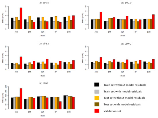Root mean squared error (RMSE) for the five DSM models applied to the training sets without residuals (black), training sets with residuals (grey), test sets without residuals (orange), test sets with residuals (brown), and the validation data sets (red). ANN, artificial neural network; BRT, gradient boosted regression trees; MLR, multiple linear regression; RF, random forest; SVM, support vector machine. Panel (a) shows the response variable pF0.0, panel (b) for pF2.0, panel (c) for pF4.2, panel (d) for AWC and panel (e) for Ksat at a depth of 30 cm.