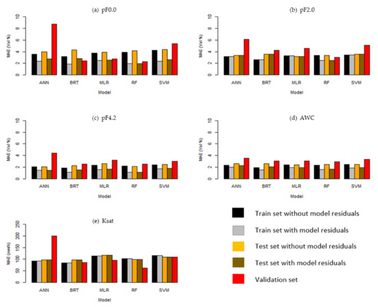 Mean absolute error (MAE) for the five DSM models applied to the training sets without residuals (black), training sets with residuals (grey), test sets without residuals (orange), test sets with residuals (brown), and the validation data sets (red). ANN, artificial neural network; BRT, gradient boosted regression trees; MLR, multiple linear regression; RF, random forest; SVM, support vector machine. Panel (a) shows the response variable pF0.0, panel (b) for pF2.0, panel (c) for pF4.2, panel (d) for AWC and panel (e) for Ksat at a depth of 30 cm.
