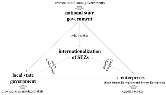 Thirdly, this paper also highlights variegated agents of the internationalization of Chinese SEZs, including state-led governance, provincial marketized state or entrepreneurship state, as well as private ventures (Figure 1). Specifically, most scholars paid attention to the dominant position of Chinese state and state-owned enterprises (SOEs) in the process of international offshoring of Chinese firms. However, under the neoliberal opening-up context, the Chinese state has experienced a process of decentered and fragmented internationalization that is featured by entrepreneurial statehood rationale [16]. Seemingly, Chinese provincial or urban state governments have been granted greater managerial autonomy to engage more in land management through combining both SEZs and foreign capital flows. Moreover, it is de facto that inexperienced private Chinese investors dominate most manufacturing investment and industrial zone development in Africa and beyond [6].