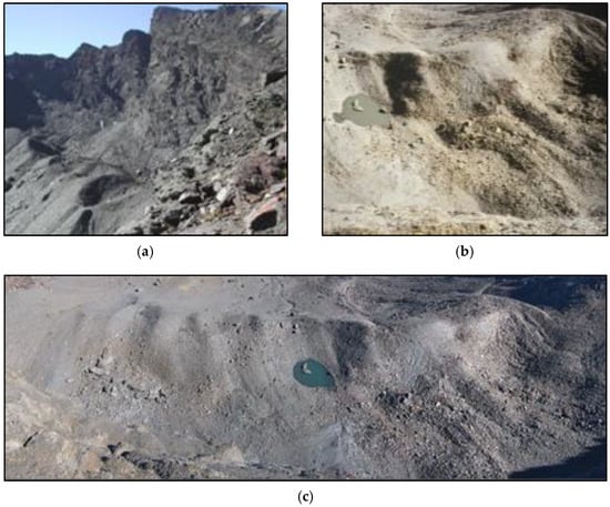 The presence of these frozen bodies, together with the previously described glacial ice and permafrost buried under detritic material from the deglaciation process, explains what the glacier must have undergone and how, once enclosed in its basin, it was characterized by a successive evolution from white glacier to black glacier, and from this to fossil glacial ice and permafrost [,]. The surface of the base of the Veleta cirque is now characterized by an amalgam of periglacial modelling resting on the relict ice of the historical LIA glacier (Figure 2c). Among this modelling, the aforementioned incipient rock glacier, the subject of this study, stands out.