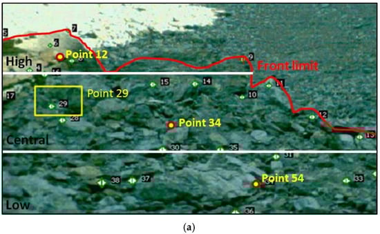 The frontal dynamic of the rock glacier was not homogeneous, as can be seen in Figure 7, in which there is an element or point representing the entire sample or set of points indicated by area (high: point #12, central: point #34, and low: point #54). In 2005–2006, the points in the upper and central parts (#12 and #34) had very similar dynamics (horizontal displacement and subsidence), as a result of the instability of the blocks and contingent upon the abrupt slope of the front.