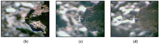 The instruments used were able to identify and monitor the movements of points observed at the same time, as they take a general photograph of the point observed (Figure 3a) and another in great detail (Figure 3b–d). Therefore, this photography serves as a guide when locating these points in the measurements made in later years. The uncertainty of the measurement made by this total station and developing the radiation technique is ±1 cm, which includes the error generated in stationing the instruments (±7 mm) and that of the instrument itself in measuring the distance without a prism, which is ±3 mm.