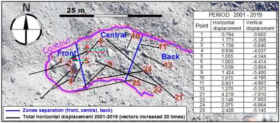 Displacement (horizontal and vertical) of the rock glacier (2001–2019).