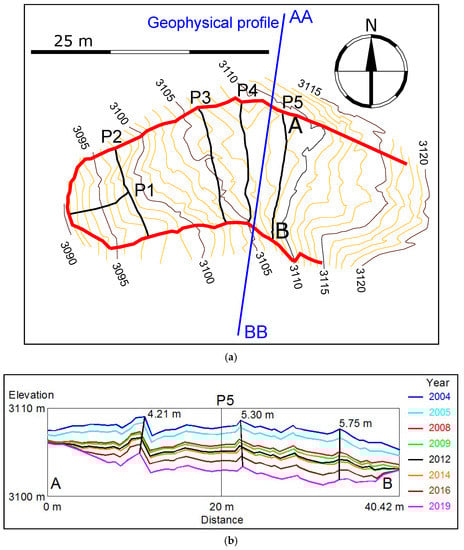 (a) Positions of the topographic profiles and the geophysical profile on the automatic cartography (Restitutor) of 2008. (b) Evolution of profile P5 between 2004 and 2019.