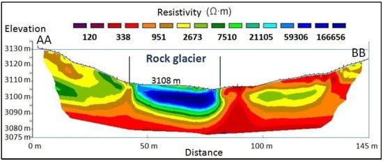 In 2009, a geophysical study was made between the topographic profiles P4 and P5 to observe the thickness of the underlying ice and permafrost (Figure 5a). The technique used was electrical prospection using ABEM SAS 4000 equipment with a mean spacing between electrodes of 2.5 m []. The penetration of up to 40 m of the geophysical profile facilitated an estimation of the thickness of the frozen mass at around 10 m in 2009 (Figure 6). Depth with respect to the surface at which the ceiling of the relict ice glaciers and surrounding permafrost were detected was at −1.20 m at an altitude of 3108 m [,].
