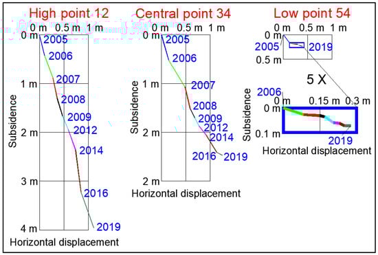 However, a moment (2008) came at which the points in the central area showed a lesser slope and tended towards behaviour similar to that of the points in the lower area (#54) in 2005–2006. Initially, the points of the lower part (2005) had a vertical displacement value similar to those of the horizontal, but from 2006 horizontal displacement became greater than vertical, the latter ceasing from 2012. What had happened to point #54 in the past is now happening to point #34, since this point has the same configuration in 2016–2019 as point #54 did in 2006–2007 (Figure 7).